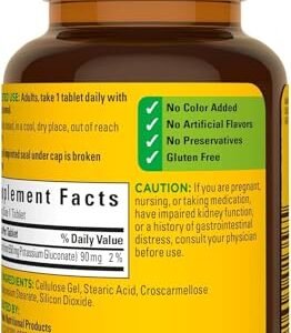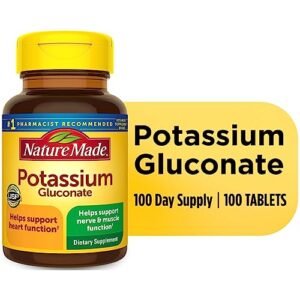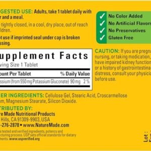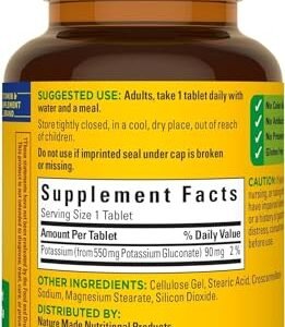 From Manufacturer: Supplementing with Nature Made Potassium Gluconate 550 mg helps support several functions of the body including water balance and distribution maintenance, pH balance, muscle and nerve cell function. A healthy potassium levels is an important part of good heart health and blood pressure maintenance. Supplementing with Nature Made Potassium Gluconate 550 mg helps support several functions of the body including water balance and distribution maintenance, pH balance, muscle and nerve cell function. Nature Made Potassium Gluconate 550 mg also supports healthy heart, kidney and adrenal function in the body, and conversion of blood sugar into its stored form known as glycogen. Helps control activity of the heart muscle Nature Made Potassium Gluconate is guaranteed to meet our high quality standards – it is made from carefully selected ingredients under strict manufacturing processes. United States Pharmacopeia (USP) Verified Formulated for easy absorption No Artificial Colors, Flavors, or Preservatives No Yeast, Starch or Gluten These statements have not been evaluated by the Food and Drug Administration. This product is not intended to diagnose, treat, cure or prevent any disease. Ingredients: Potassium Gluconate, Cellulose Gel, Stearic Acid, Croscarmellose Sodium, Magnesium Stearate, Silicon Dioxide. No Artificial Colors. No Artificial Flavors. No Preservatives. No Yeast. No Starch. No Gluten. Dietary Facts: It is very easy to obtain your potassium needs by your diet. The best sources of potassium are fruits and vegetables. Bananas, potatoes, citrus, tomatoes, prunes and spinach are all considered high potassium foods. As ingredients may change from time to time, please check the label on the bottomHelps control activity of the heart muscle1 Bottle of 100 Tablets