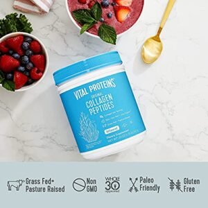 Collagen Peptides Benefits: – Promotes youthful skin, healthier hair, and stronger nails – Improves skin smoothness – Helps keep bones healthy and strong – Supports joint health – Contributes to a balanced diet and helps maintain weight – Natural glycine promotes healthy immune, digestive, and central nervous systems What are Collagen Peptides? Collagen is the most abundant protein in the body and is a key constituent of all connective tissues. Collagen provides the infrastructure of the musculoskeletal system, essential for mobility. Peptides are short chain amino acids naturally derived from collagen protein. These natural peptides are highly bio-available, digestible and soluble in cold water. The intake of collagen ensures the cohesion, elasticity and regeneration of skin, hair, tendon, cartilage, bones, and joints. Collagen is a natural and healthy ingredient that has been used for centuries. Collagen-rich foods are a large part of traditional diets. Our ancestors utilized whole-animal nutrition, which provided an abundant amount of collagen, the native form of gelatin. Over time, we have lost touch with this powerful, healing superfood. Vital Proteins Collagen Peptides are sourced from pasture-raised, grass-fed bovine hides from Brazil to ensure a natural, high quality, and sustainable source of this ancient nutritional powerhouse. These Statements have not been evaluated by the Food and Drug Administration. This product is not intended to diagnose, treat, cure or prevent any disease.Pasture-Raised, Grass-Fed, Non-GMO, Kosher; Soluble in cold liquidsPromotes youthful skin, healthier hair, and stronger nailsHelps keeps bones healthy and strong, supports joint healthContributes to a balanced diet and helps maintain weightWhole 30 Approved